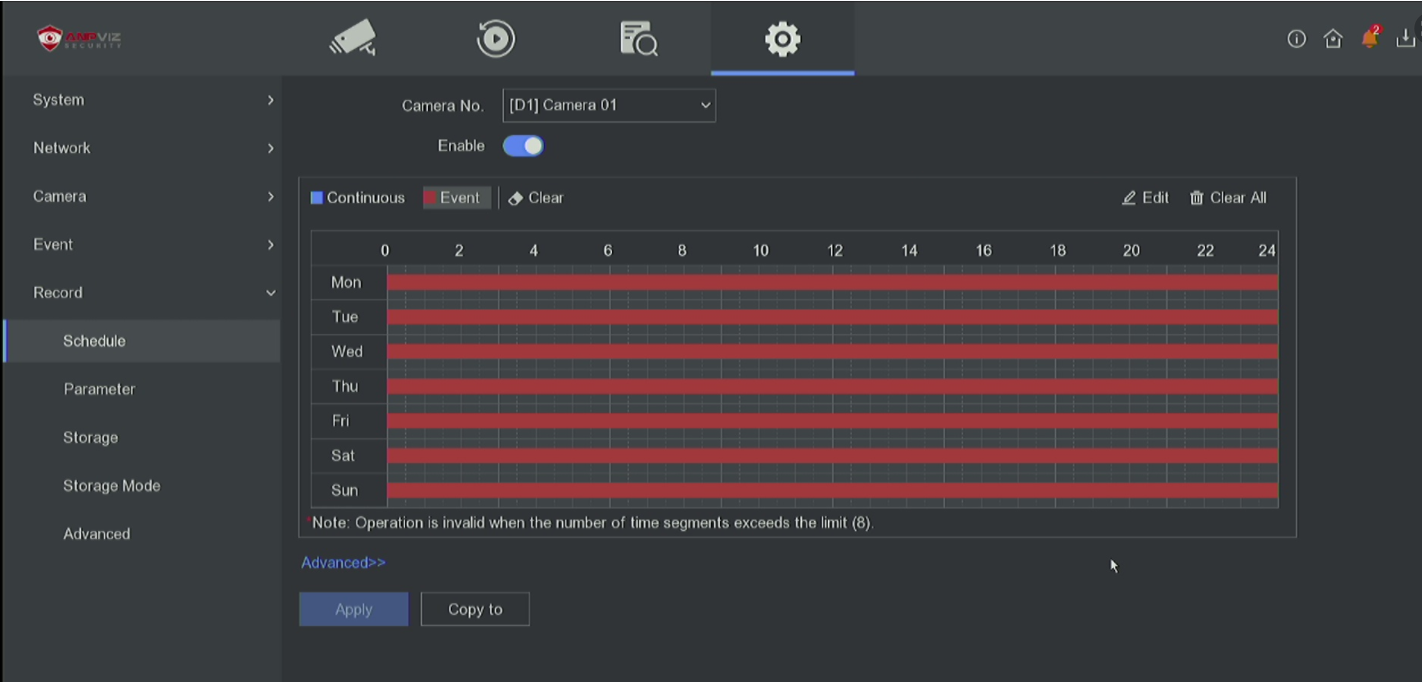 Step 1. Log in to your Anpviz PoE NVR on a monitor. Go to Menu >Configuration> Record > Schedule page, then select the channel (camera) and check the Enable box. Select Motion or Event and tap on the grids to choose the time that you want to enable motion detection recording for, and then click Apply to save the settings.