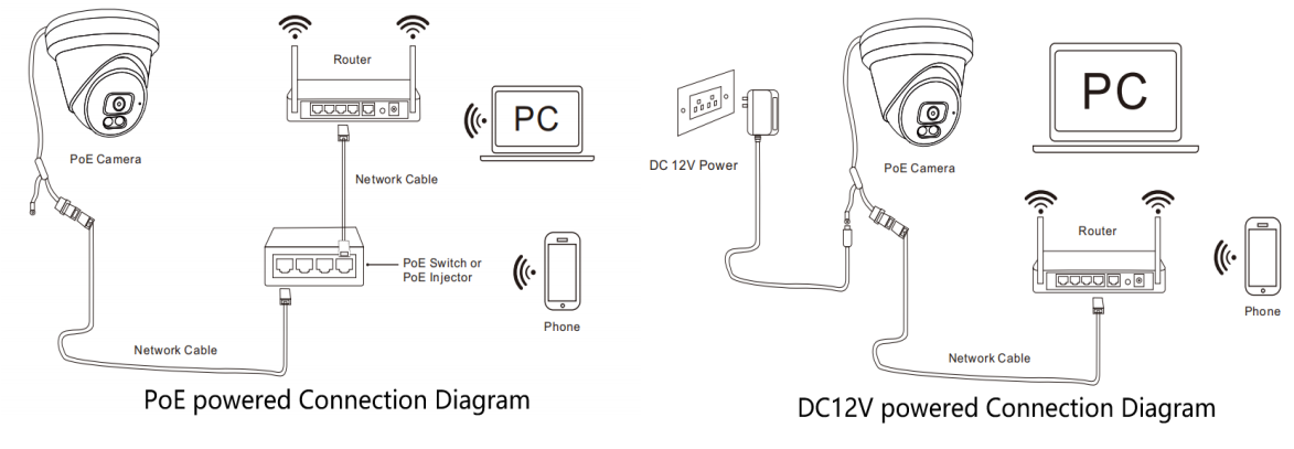 1. The camera must be powered by DC12V power supply or DC48V POE switch