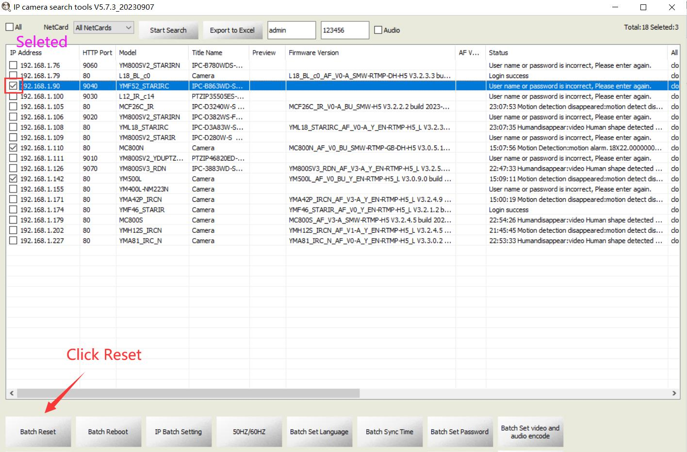 If you forget the password or want to reset the camera settings, please install the search tool to search the camera IP, and then click the factory reset button, the operation is as follows: